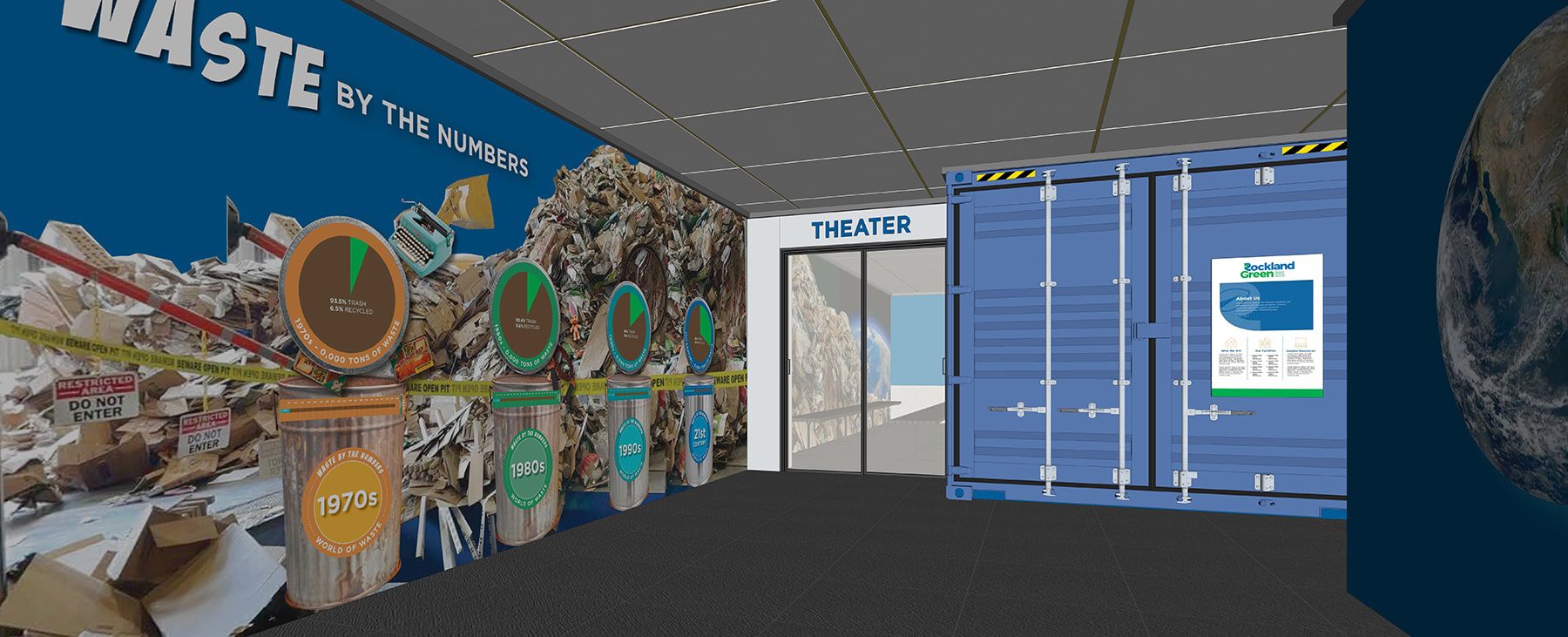 THE ROCKLAND GREEN EXPERIENCE is a 1,500 sq. ft. recycling education center scheduled to open in the spring of 2026. The center includes multiple interactive exhibits that follow the process of recycling from residential collection and special handling to new manufactured products. A fully immersive theater inside a simulated container offers a show select for three different wide screen presentations tailored to different age audiences. Controlled lighting with 5.1 sound-around and vibrating benches lend to the full sensory experience.